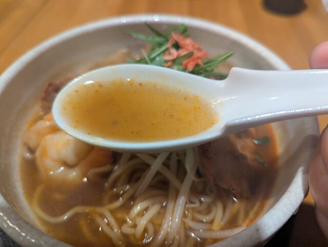 少し待ってラーメンがやってきた。トムヤムクンのようなものをイメージしたのだけれど、見た目はいわゆるラーメンっぽい。スープを一口いただくと、海老の風味と旨味がどがしゃんとやってくる。色味だけ見ると薄味に見えるが、これがまあおいしいしちょうどいい。スパイス感もしっかりあって、ただそれほど辛くない。日本人に合わせているのかもしれない。