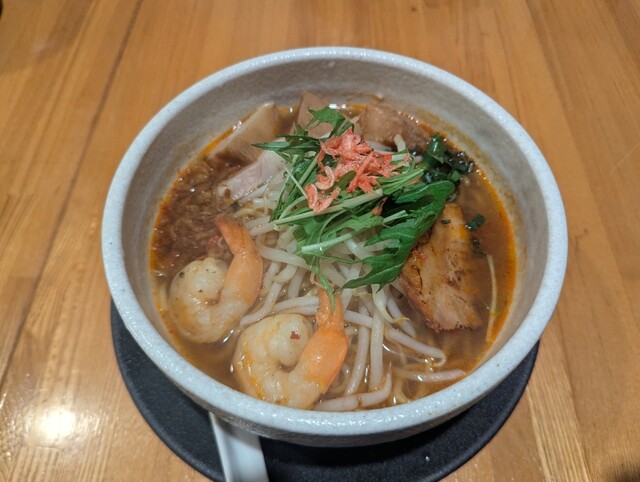 店内は居抜きで3店舗前くらいから同じレイアウトだ。手前にカウンターがあって、奥に少し広めのスペースがある。カウンターに座ってメニューのはじめに書かれている「旨辛海老ラーメン 玉子入り」(1,000円)を注文した。