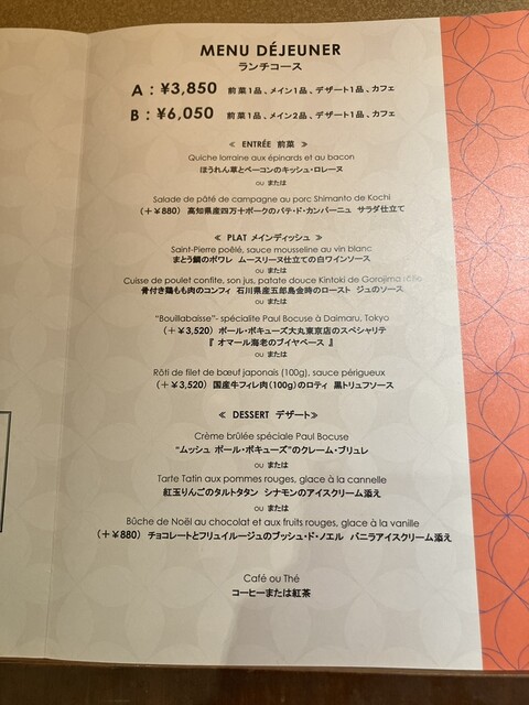 料理は前菜、メイン、デザート、コーヒーのAランチ(3850円)に