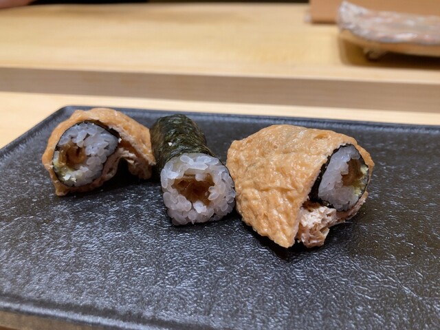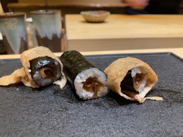 お詳しい方なら巻き物でお気付きになられるかと、油揚げに干瓢巻きを入れる…助六。