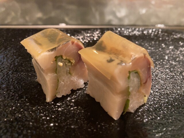 まぐろ皮 ズワイガニジュレかけ 鯵海苔巻き