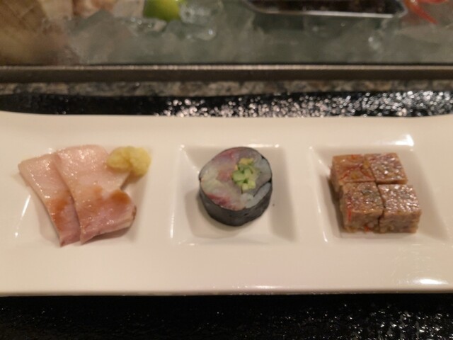 3点盛りマグロの皮 海鼠 鯵の磯辺巻