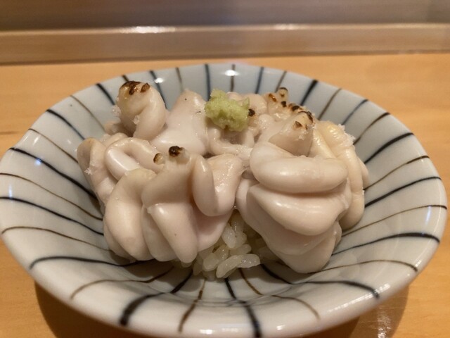 今回も熟成かけてる魚が多く、今回は同じ個体のまぐろで21日目。完全に脱水されてしっとりな旨み詰まった握りでした。蛇腹の筋が切り取り線みたく剥がれていくくらいです。