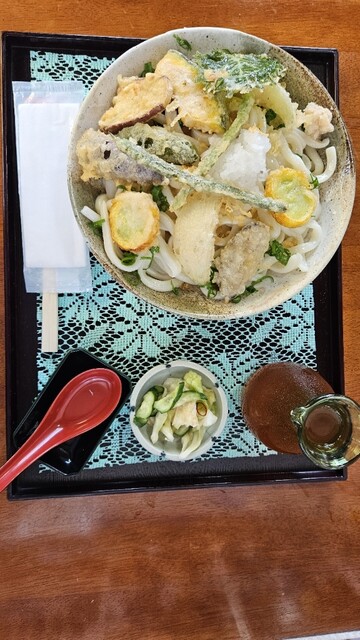 冷たいおうどんに天ぷらが散らしてあり、冷たいお出汁とお漬物が添えてあります。