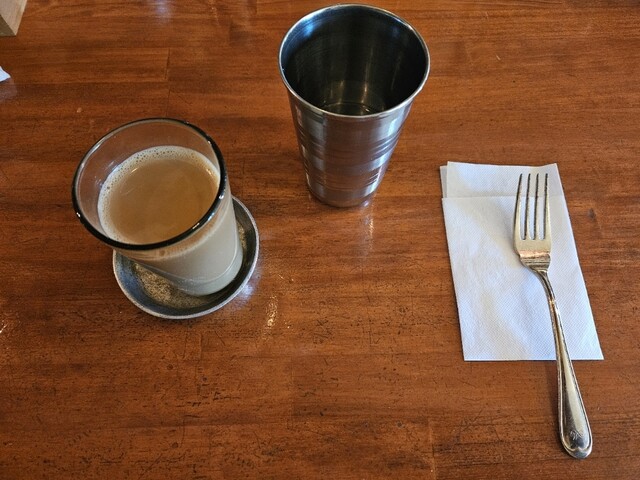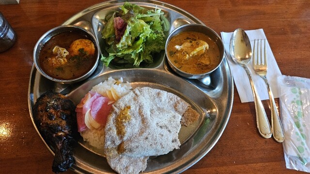 今日はスペシャル・ターリーランチをお願いしました。カレーはムルガ・マサラと南インド風チキンカレーを選択。食後にアイスチャイも。