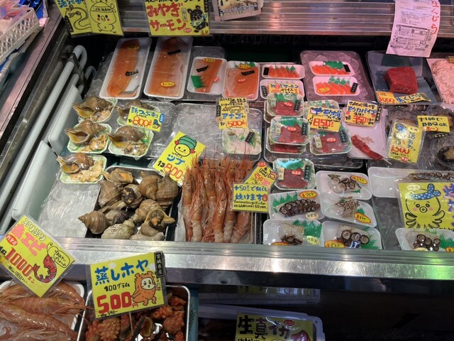 仙台朝市で海鮮を目当てに向かった先はそう、このこがね海産物。店員さんにいろいろ勧められ食べたいものをこれでもか!というくらい購入し店先でいただきました\(^o^)/もう美味すぎてずっと口の中が幸せで「オーマイコンブ!」状態でした。珍しい珍味もたくさんありました!