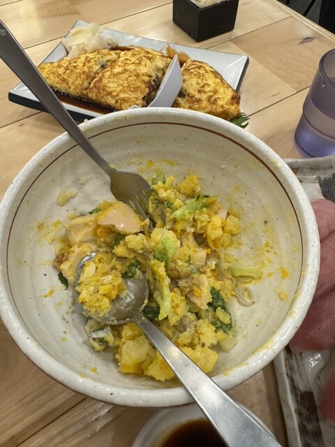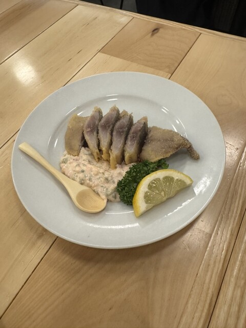 オカモポテサラ500円(こちらは自分で潰して仕上げるサラダです。ジャガイモがホクホクで美味しい!)、生レアアジフライ640円とコスパも良いです。。握り寿司もネタが大きくで美味しいです。