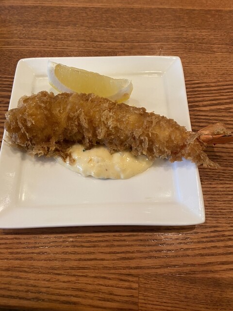 海老フライも追加で1本ずつ注文しました。タルタルソースたっぷりで、海老はプリッとして美味しかったです。でも、欲張りすぎました