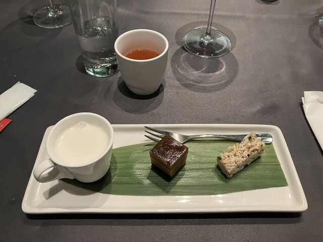 鮮明な莢エンドウと黒皮白身の切り身の対照で、皿の上に賑やかなムラが描かれた。先日山頂小径で見た一面の荒い山壁を彷彿とさせる。ただし、長年の腐蝕によって出来た自然美と違って、技術が芸術に成り上がった瞬間は厨房の中の人間のみ知る。