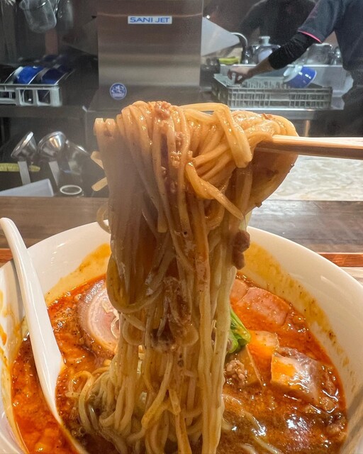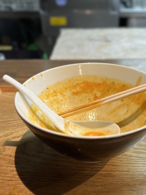 濃厚担々スープ、麺はモチモチで平打ち細麺にこの濃厚担々スープが良く絡むめちゃくちゃ美味かった。個人の感想ですが、中村麺三郎商店さんの担々麺の濃厚さ美味さレベルでした。