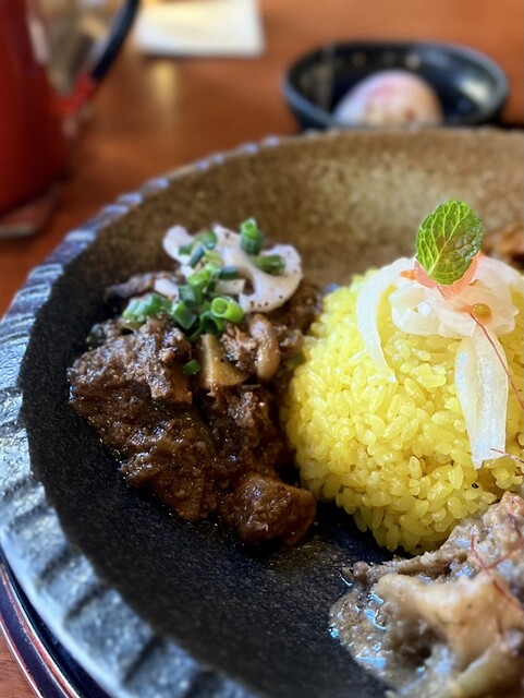 全がけ(3種)TP温玉 2.干し柿とアーモンドのマッシュポテトのせタマリンドの酸味がたまらん香ばしポークキーマ