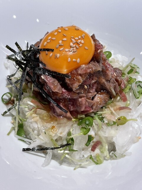 締めの和牛のせいだ飯は、卵黄と和牛のコクがご飯と絡み合う王道の美味しさ。