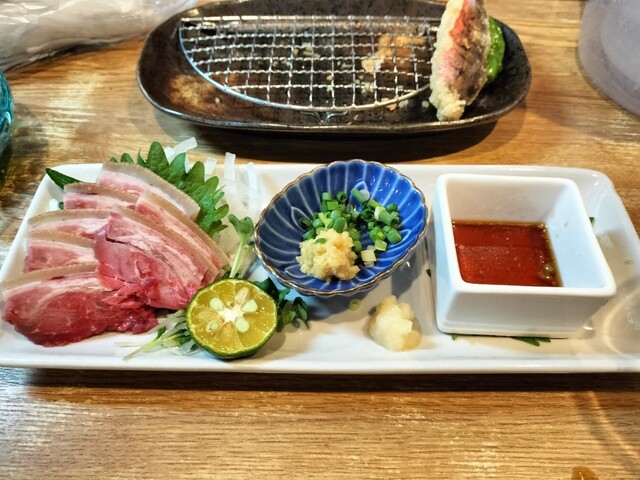 お通し(白身魚フライ焼き、玉ねぎとなにかの和え、オクラマヨ)、グルクン、活車海老の一本焼き、(先端の)筍炭火焼き、、ヤバい泡盛(國華30度)二合目です。
