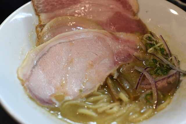 トッピングに菜の花や半熟玉子、そしてチャーシューは肩とバラとささみという感じでした。