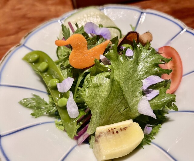 可愛い鶏型の盛り付けに心奪われる。さっぱりドレッシングでリセットにも◎。