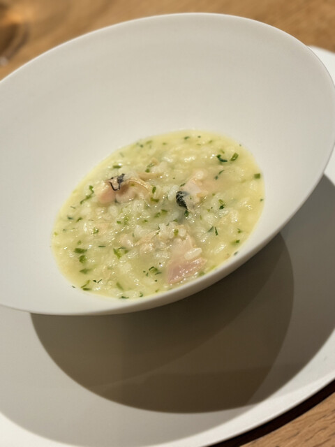 アンチョビマヨ、ムール貝のタルタル、ハーブオイルの香りが複雑に重なり、春の新緑を思わせる一皿。