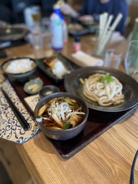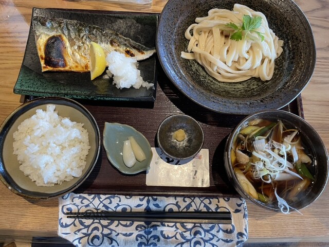 今日はいい鯖の仕入れしたと聞いて、焼き鯖肉汁つけおうどんセット+ノンアル付き〜