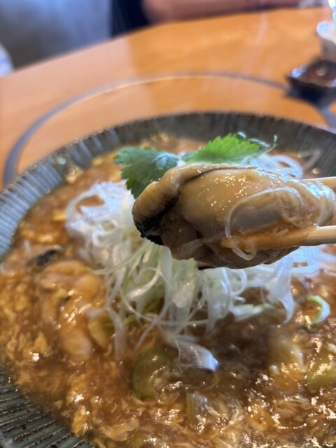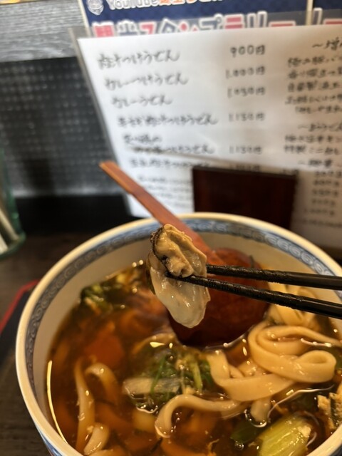 美味しく食べすすめると、奥からなんと!そう!柿が!!!いや牡蠣が〜!!!そう!かき玉うどんはなんと、牡蠣玉うどんだったのです!嬉しいサプライズ☺️美味しい!バンザイ(いつもはできないようです。気をつけてください)❣️