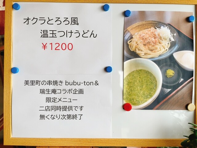 埼玉県北の友情コラボ!オクラとろろ風温玉つけうどんの情報をつけ、熊谷市上奈良の瑞生庵に行きました!美里町の串焼きBuBu-ToNとのコラボうどんです!
