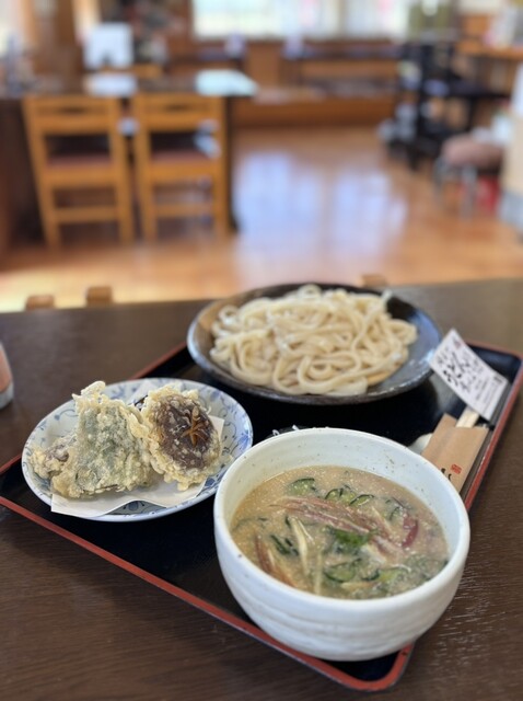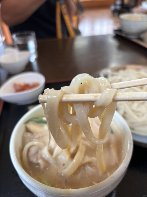 この前○どん子さんが、食べてたアレを食べにきました。開店直後に到着し、駐車場には先客れ知り合いでした!PP入店し二人でアレを注文!そう!濃厚豆乳味噌の肉汁うどん❣️めっちゃ楽しみにしてました。味変のネギキムチも〜!