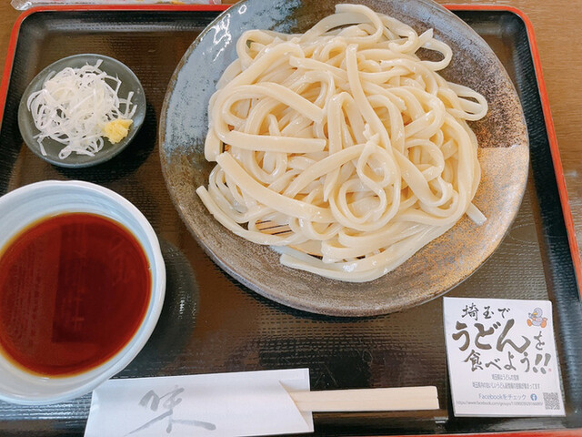 待つこと10数分で、水で〆る音の直後の「はい!お待ちっ!」とご主人の声とともに透明感のある艶々で埼玉県北にしては珍しく⁉︎角の立ったおうどんの登場です