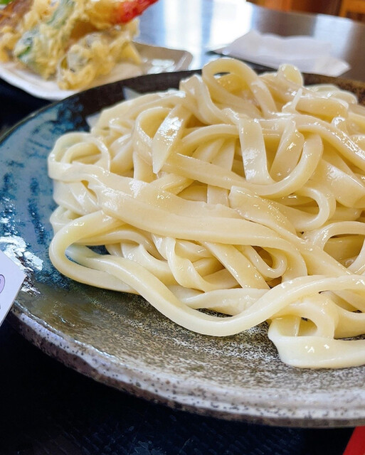しばし歓談して待つこと10分程度で、着うどん❣️ピカピカ✨✨の平打ち麺と綺麗な天ぷらは笑顔になります