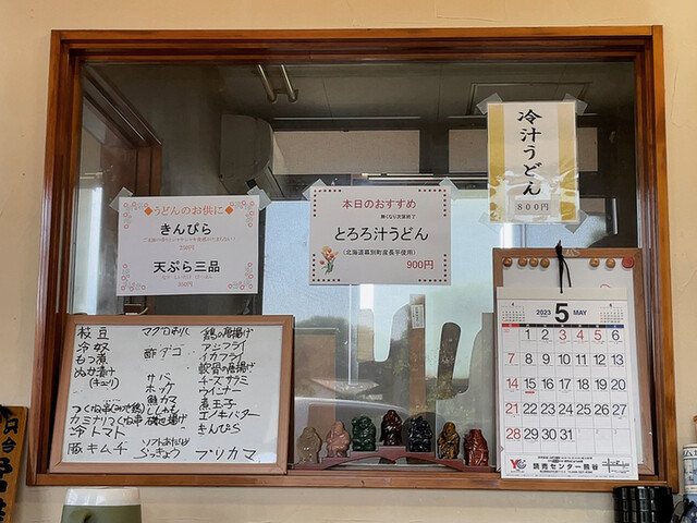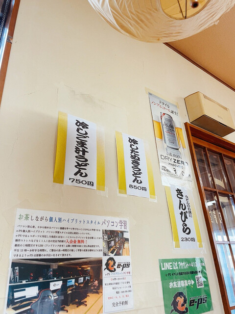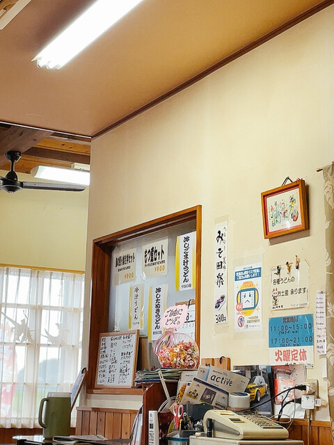 店内に入ると結構広くて、テーブル席が3つにカウンター席と、奥には小上がり席が3つあり、メニューを見るとおうどんメインです。