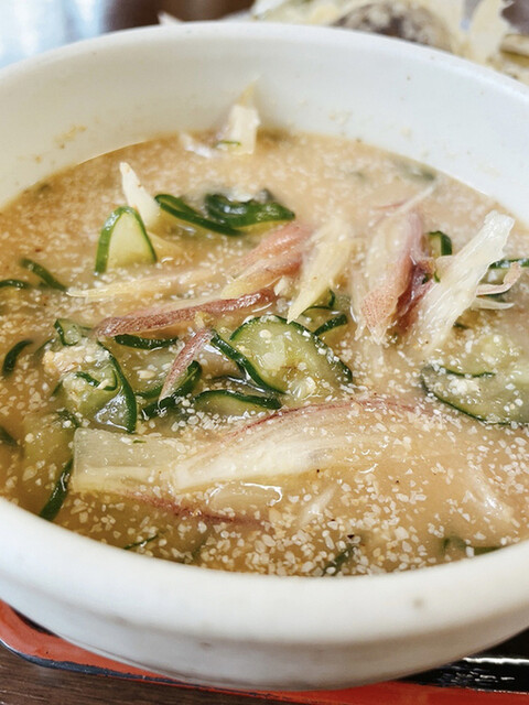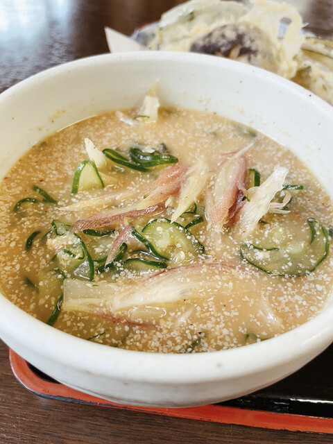 待つこと10分弱で美味しそうな天ぷらと冷汁が着どん❣️久しぶりのご対面です。平打ちっぽいおうどんは塩分控えめでもちもち❣️冷汁につけて食べるとお味噌と茗荷きゅうりが絶妙なハーモニーめちゃ旨です!美味しい美味しいであっという間に食べおわりました!