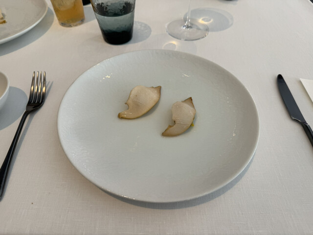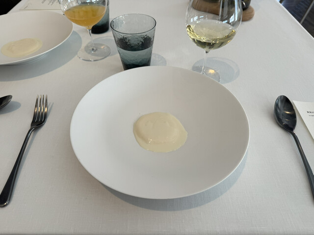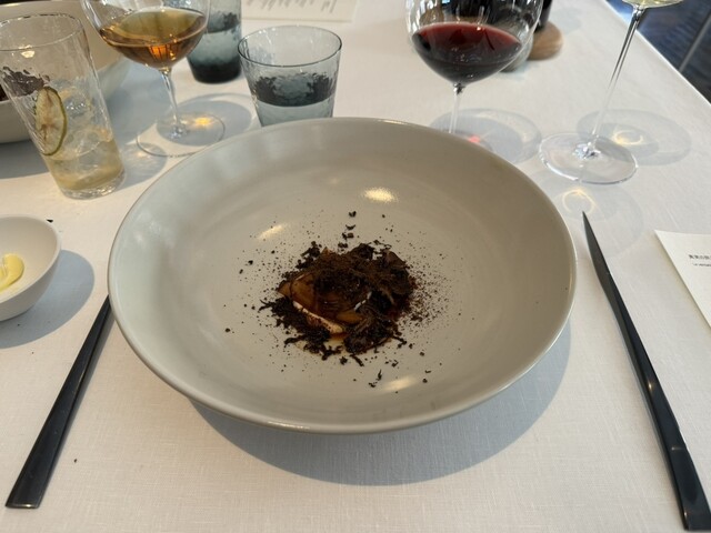 羊乳のまろやかで優しい味の中に柚子の香りがほのかに隠れていて絶妙です。羊乳の下には細かく刻まれたパースニップがあり、食感によいアクセントを与えてくれます。添えられたオリーブオイルとトリュフのペーストも個を主張しすぎずで見事にまとまっていました。お料理名の「冬の大地」の通り、羊乳が雪原、トリュフペーストが雪から覗く大地を表現しているとのことで、お皿の上のその箱庭的世界観も好きでした。