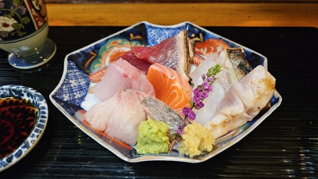 お造り盛合せ(鰹、鰤、クロムツ、富士サーモン、金目鯛、みずだこ、鰆の塩たたき、シマアジ…)