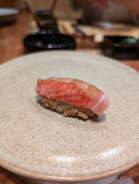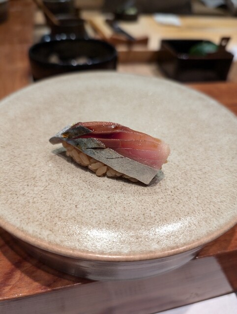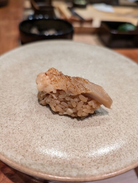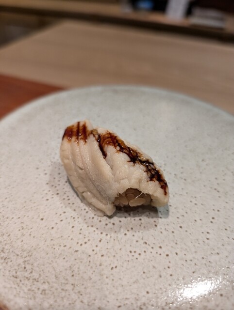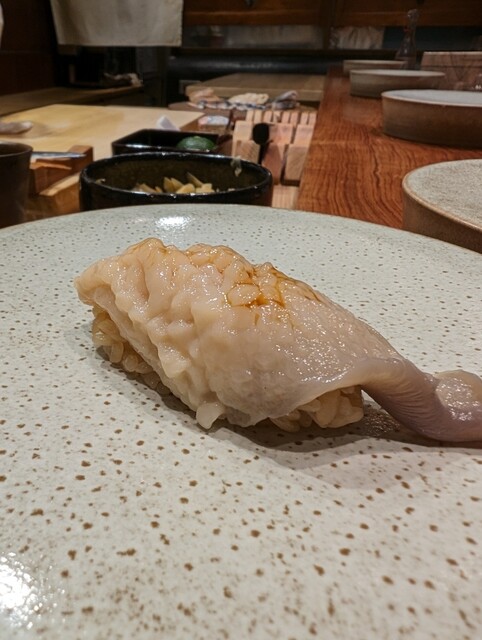 コースはシャリと海苔のテイスティングからのイチオシの定番である贅沢な鮪巻(もうここでいつも心が満たされます)からスタート。貝や光り物などを随所に交えた15貫、加えて小鉢数種を楽しく美味しく感動と共にじっくり味あわせていただきました。ホッキ貝は敢えて裏返しで舌触りに変化をつけて、イカは下拵えでとにかく柔らかくとろけるように、瞬間燻製の手際は香りも非常に芳しく、などなど要所要所の仕事の繊細さが凄いです。そして客は黙って食え、ではなく大将が丁寧にその創意工夫を解説していただけるのでその意図まで理解して食することが出来、口にいれるともう美味しさもありがたみも倍増で唸り声が自然と出てしまいます。