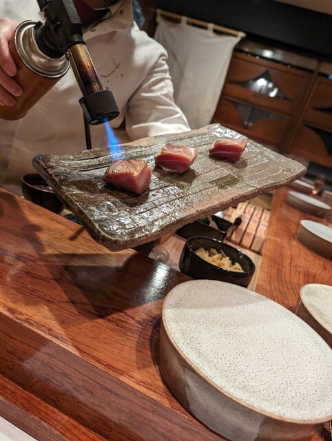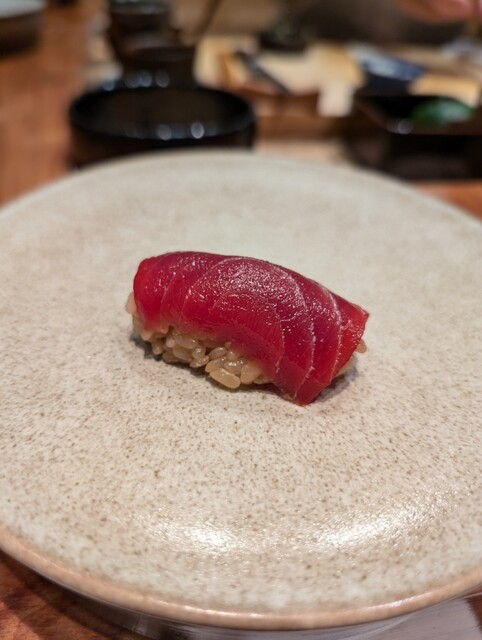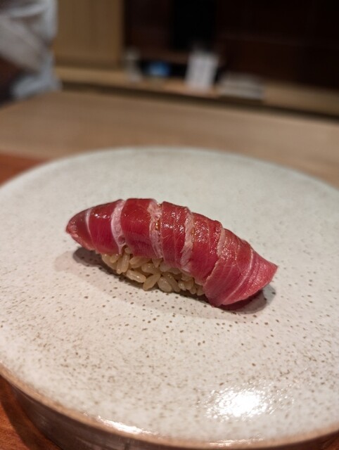 コースはシャリと海苔のテイスティングからのイチオシの定番である贅沢な鮪巻(炙りがとても香ばしいです)からスタート。貝や光り物などを随所に交えた15貫、加えて小鉢数種を楽しく美味しく感動と共にじっくり味あわせていただけます。ホッキ貝は敢えて裏返しで舌触りに変化をつけて、白子の表面にはキラキラ輝くお塩とトリュフの香り付けが、秋刀魚は肝の苦味が隠し味で、シャインマスカットと生ハムクリームチーズはワインとの相性も抜群などなど要所要所の仕事の繊細さが素晴らしいです。