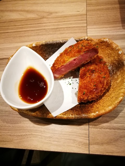 ハムカツは1cm くらいの厚さ。衣サクサクです。