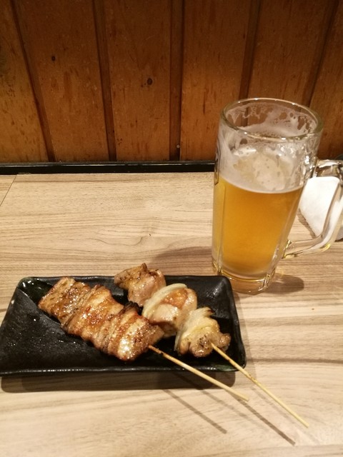 焼き鳥の肉は大きめでジューシー、間の玉ねぎが良いアクセントです。豚はバラ串で良い味です。