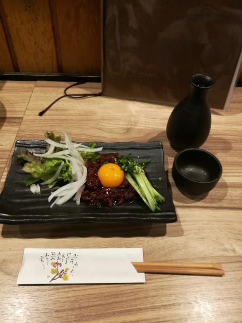 馬肉ユッケは少し甘めですが、玉子の黄身と合わせるとちょうど良い感じになります。