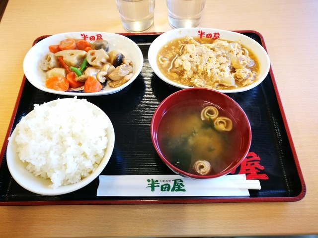 ご飯ミニ、筑前煮、カツとじ、味噌汁