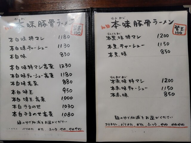 18:15着、先客4名、カウンター席に着座、後客1名。取りあえずメニュー表(メニュー写真)検討、ここは件の品で、今までウリだった博多豚骨の「本味」を差し置いてメニュートップにある「塩豚骨中華そば」からデフォの“塩豚骨中華そば”(920円税込)をタブレットでオーダーする。(因みにG系の「きま八郎」がメニュー落ちしているが、会計時におねーさんに聞くと姉妹店「信州麺屋 きまはち商店」では提供している模様。)