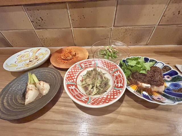 前菜の6品から絶品の数々、ヨダレ鶏、タコ、椎茸唐辛子揚げ、ビールによく合い、箸が進みます。