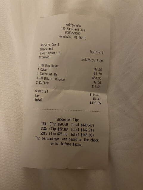 で、金額は料理と税で$119.85+tip$25.18(22%)のtotal $145.03…高っ!
