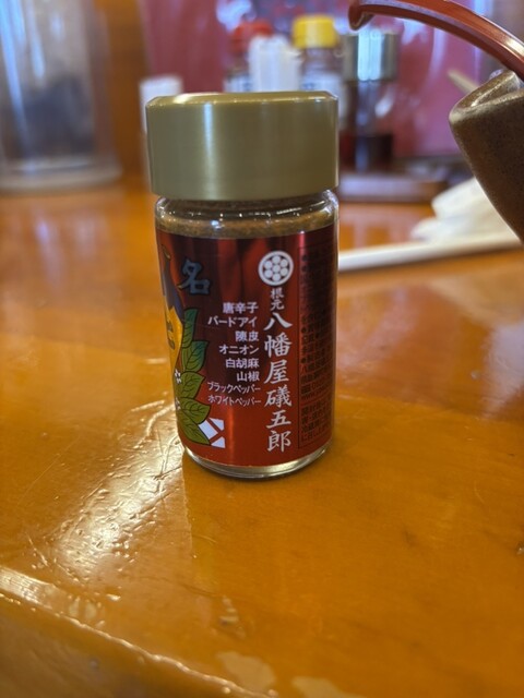 卓上の八幡屋蟻五郎と書いてある七味が独特の柑橘系風味があり、味噌によく合うんですよ。