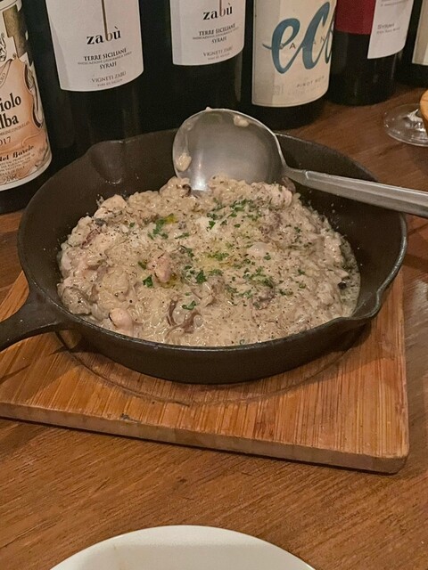 今回は、ゴルゴンゾーラのニョッキ、リゾット、マッシュルームのチーズがけ、アヒージョをいただきました i。特にゴルゴンゾーラの濃厚な風味が楽しめるニョッキは絶品で、ワインとの相性も抜群。リゾットはシンプルながら素材の旨味が際立ち、何度でもリピートしたくなる味わいでした