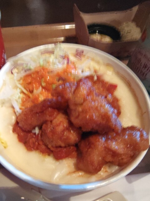 フライドチキンのライスボウルも、つまみにチキンを食べて締めにご飯を食べながらで美味しく頂きました。