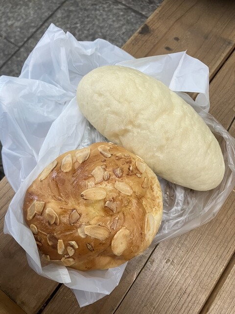 信号渡ってニッシンベーカリーでパン購入。できるだけプレーンなやつ2つ。