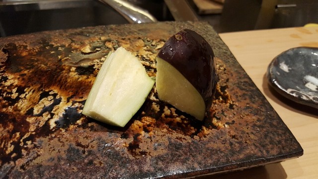 松葉ガニの甘味が濃く、焼きナスの香ばしい甘味、マスカットの甘味、キャビアの塩味がバランス良く融合。