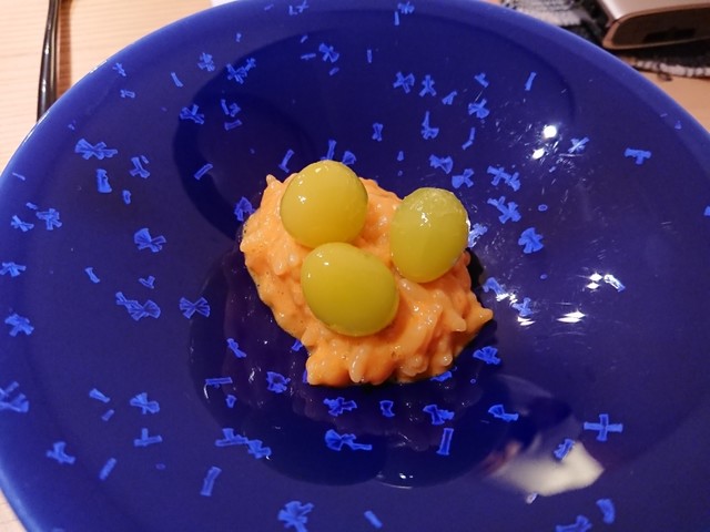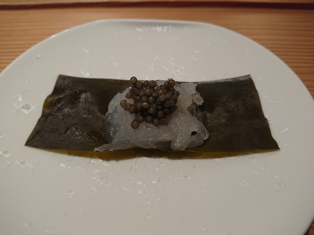 毛ガニの甘味、焼きナスの香ばしさと甘味、マスカットの甘味、キャビアの塩味、カニ酢の優しい酸味、全てが見事にマリアージュ。とても美味しいです。