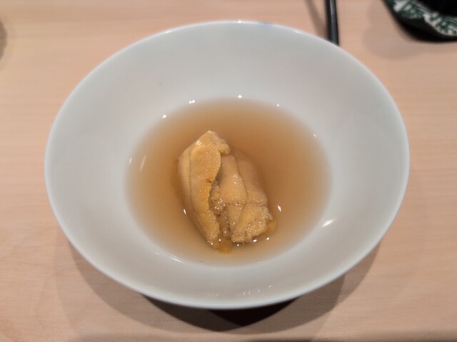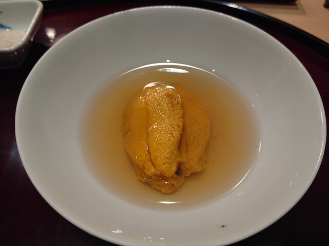 一品目の鮑の調理時に出たお出汁にウニを加えて提供。