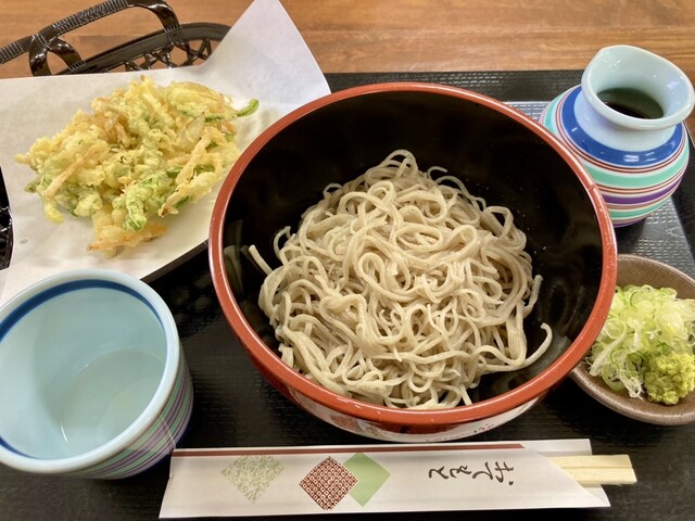 先に天盛りそばが到着。かき揚げは、ピーマン、人参、玉ねぎの内容です!揚げたてサクサクで野菜の甘みもよくでていて美味しい✨