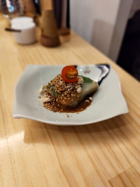 最初は手羽からあげ。肉汁溢れるジューシーさで今日イチのしっかり濃いめの味つけ。続いて鳥のみぞおち部分とシシトウの天ぷら。みぞおちは肉の繊維が多くて歯ごたえしゃくしゃく。