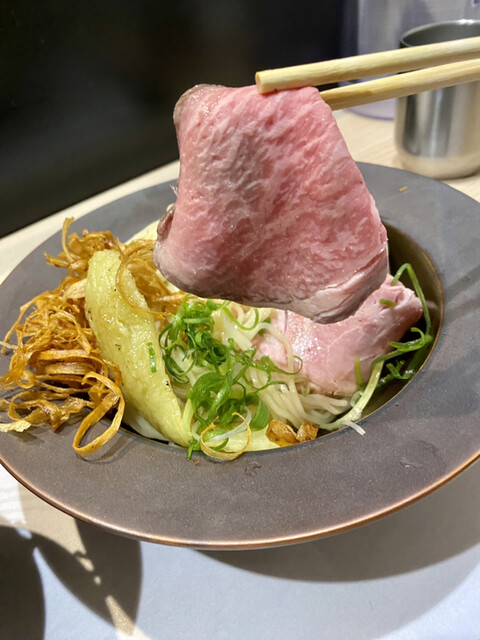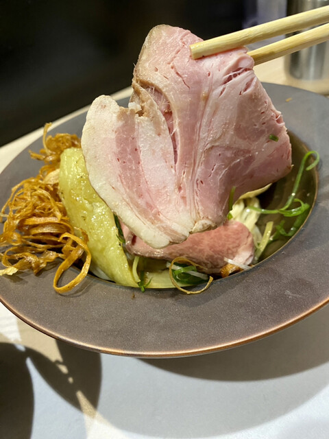 そして牛と豚のレアチャーシューが一枚ずつ綺麗にトッピング。