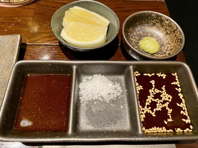 焼肉のタレ 上段:レモン、ワサビ 下段:醤油、塩2種類、タレ